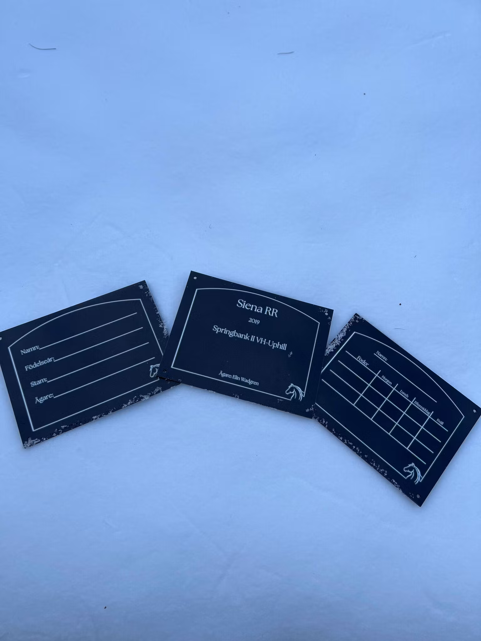 Fyll i vilka skyltar du vill ha, blanda fritt mellan boxskylt, personlig skylt och foderstats skylt. Om du har valt en eller flera personliga skyltar skriv informationen det ska stå på samtliga skyltar i den sista rutan, skriv tydligt. Samma pris gäller oavsett vilka skyltar du väljer.